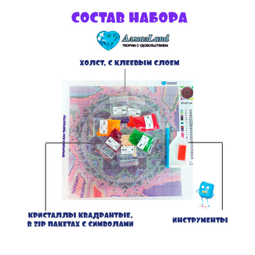 Размер 40х30см без подрамникаСостав: инструменты для алмазной мозаики (пинцет, стилус, лоток, гель-клей для стилуса, зип-пакеты с симвалами как на холсте, насадка на стилус ),холст, инструкция, компле.. Читать полностью